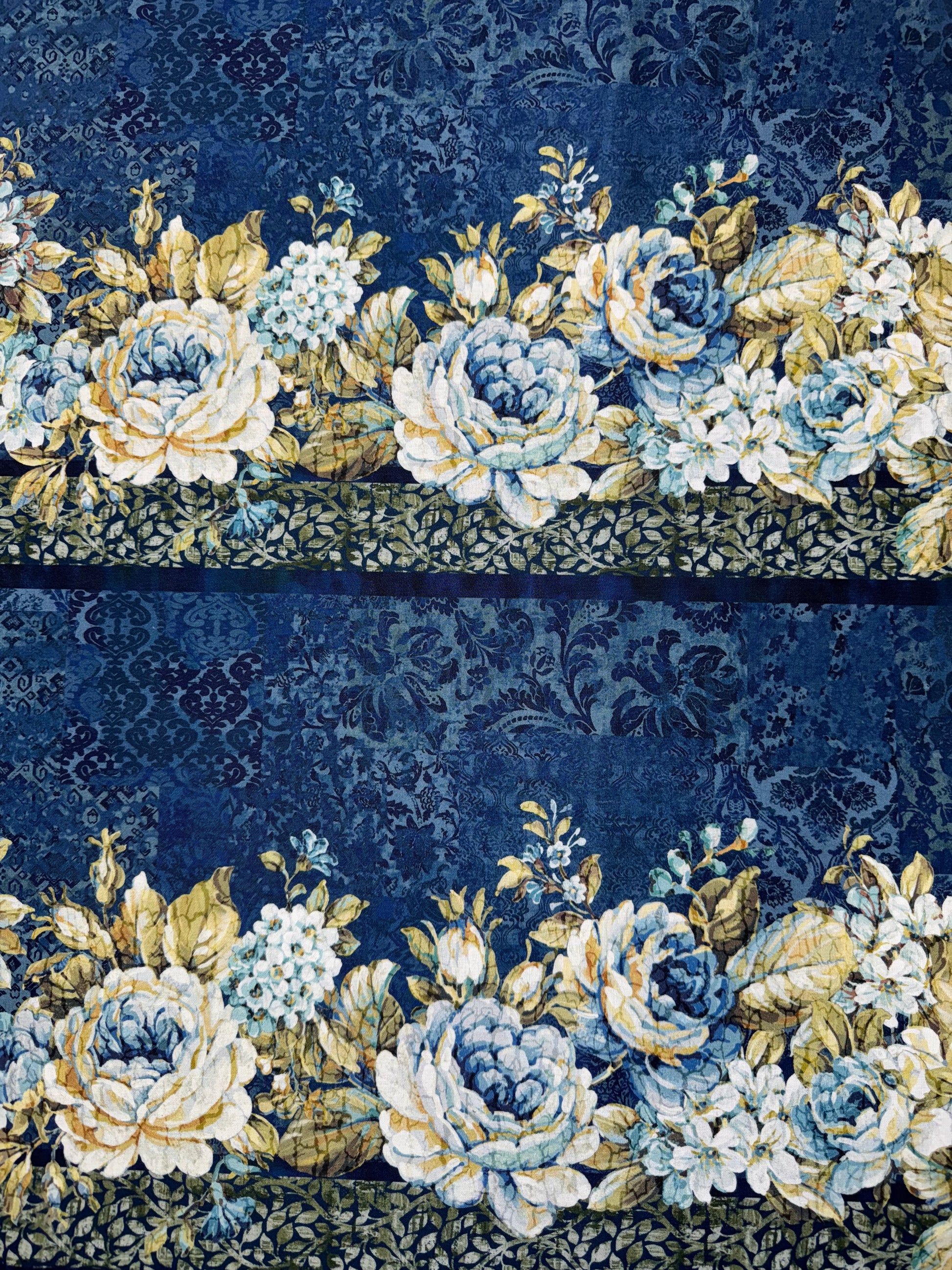 Stunning Blue Floral Border Fabric of the Carpet Bag Romance Range of Fabrics. There are 4 repeats of the Border pattern across the width of fabric.