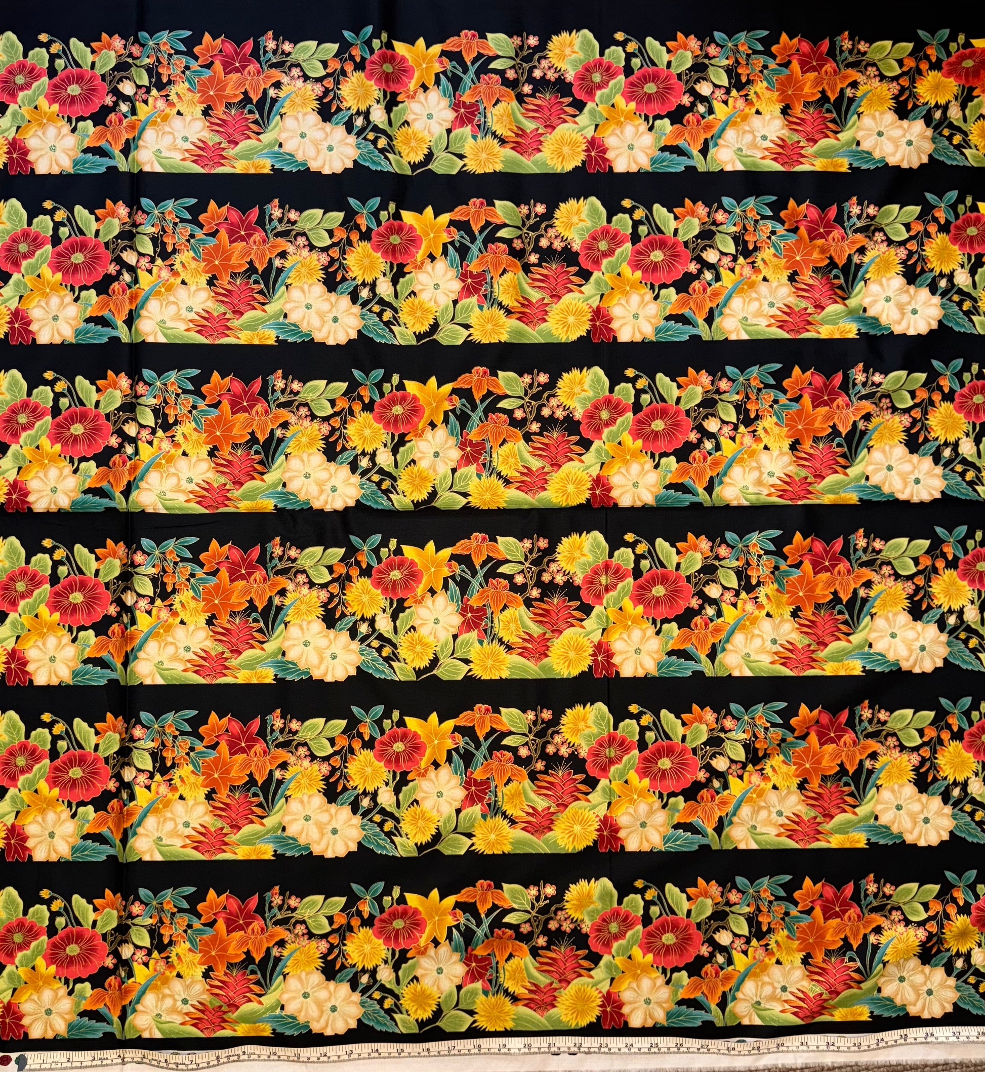 The Border Print in YOMU features six, aligned borders that are 6" high, with room to cut them into individual strips. The design is perfect for hexagonal, kaleidoscope, stack and whack designs, as well as bag panels, borders, fussy cutting for Dresdens, Fans and more. All the flowers and foliage features in this print can also be found in the Panel design.