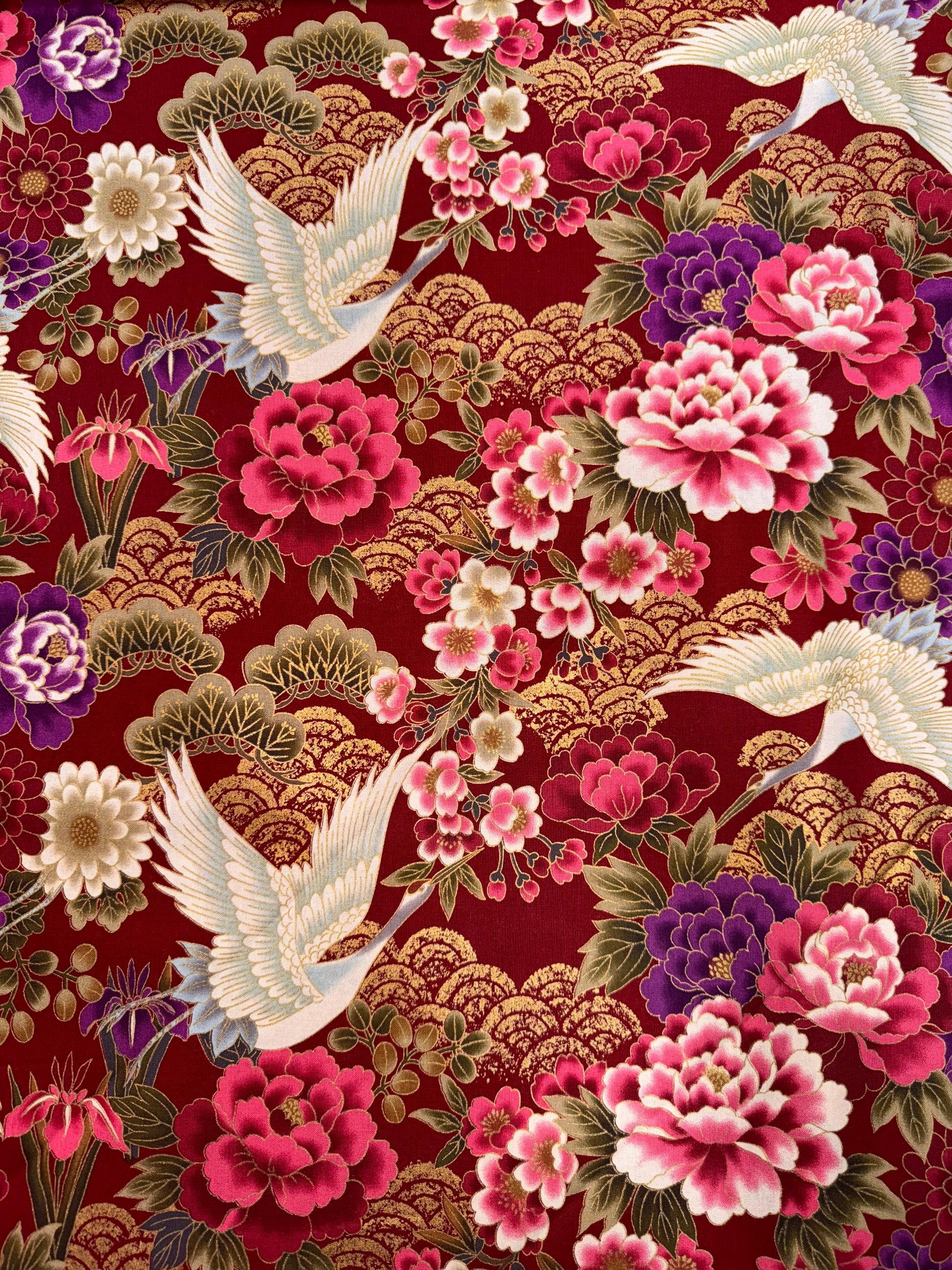 Japanese Kio Kio Red Floral and Cranes on Red background