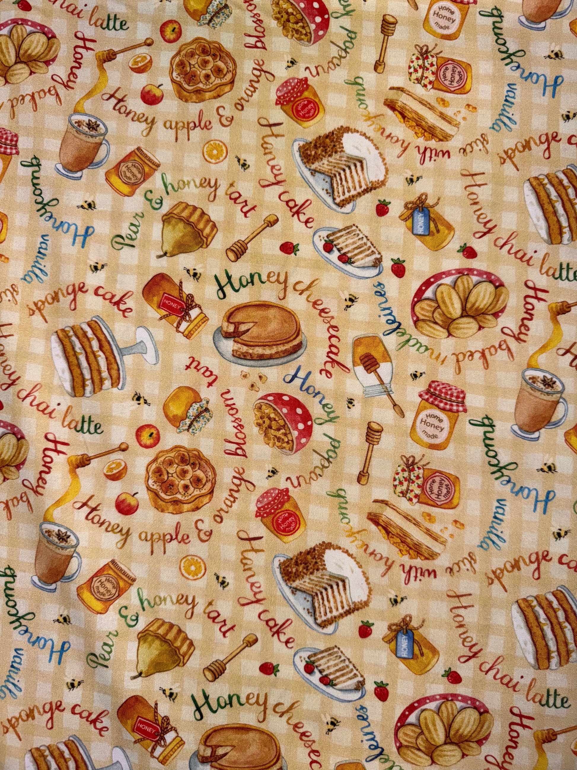 Fun Honey Cakes all over a Honey coloured Gingham background.