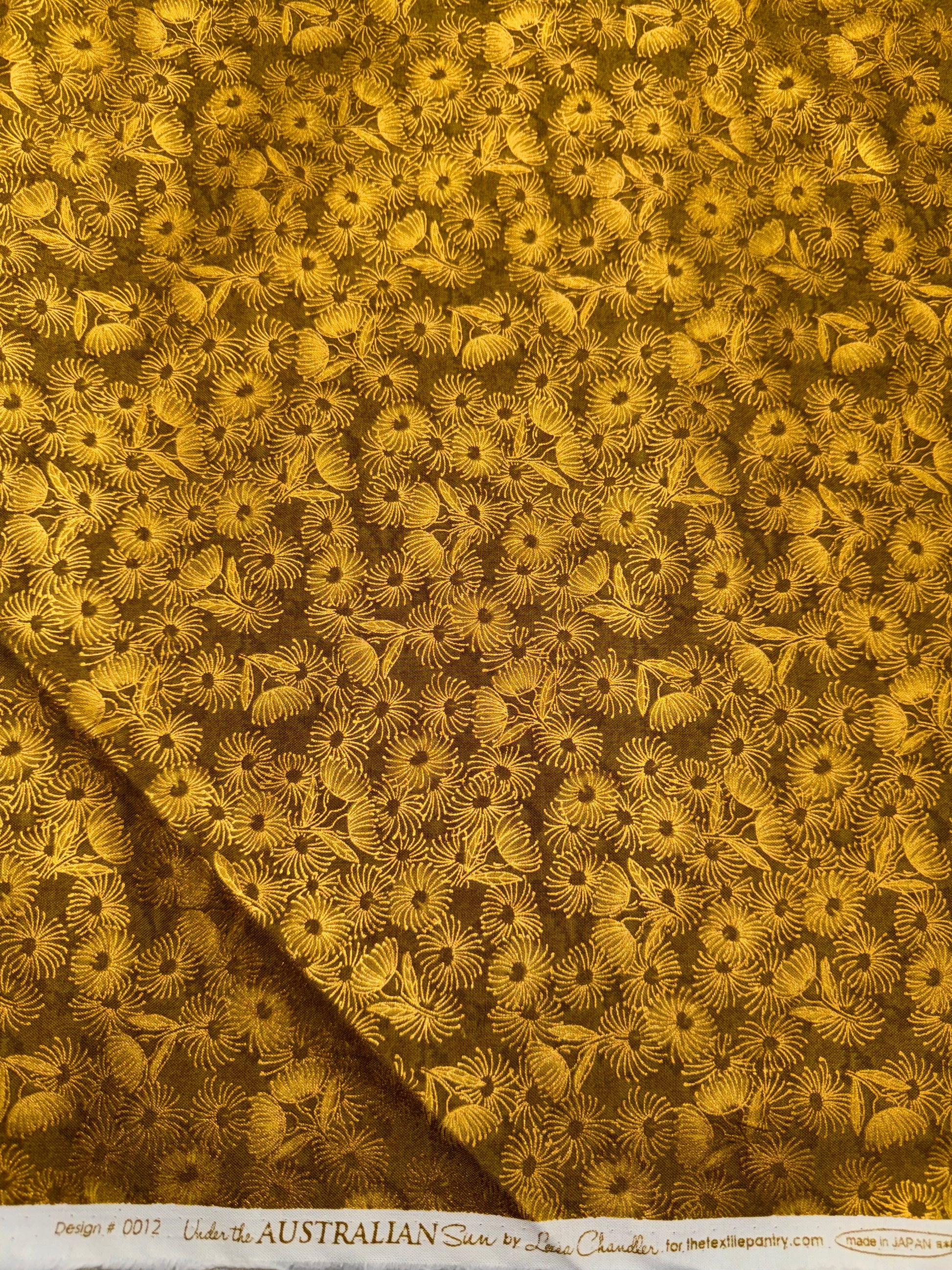 Gorgeous Gold Flowering Gums on an Olive background with highlights in metallic gold. Confidently mix and match with other Under the Australian Sun prints in the Traditional colour story.