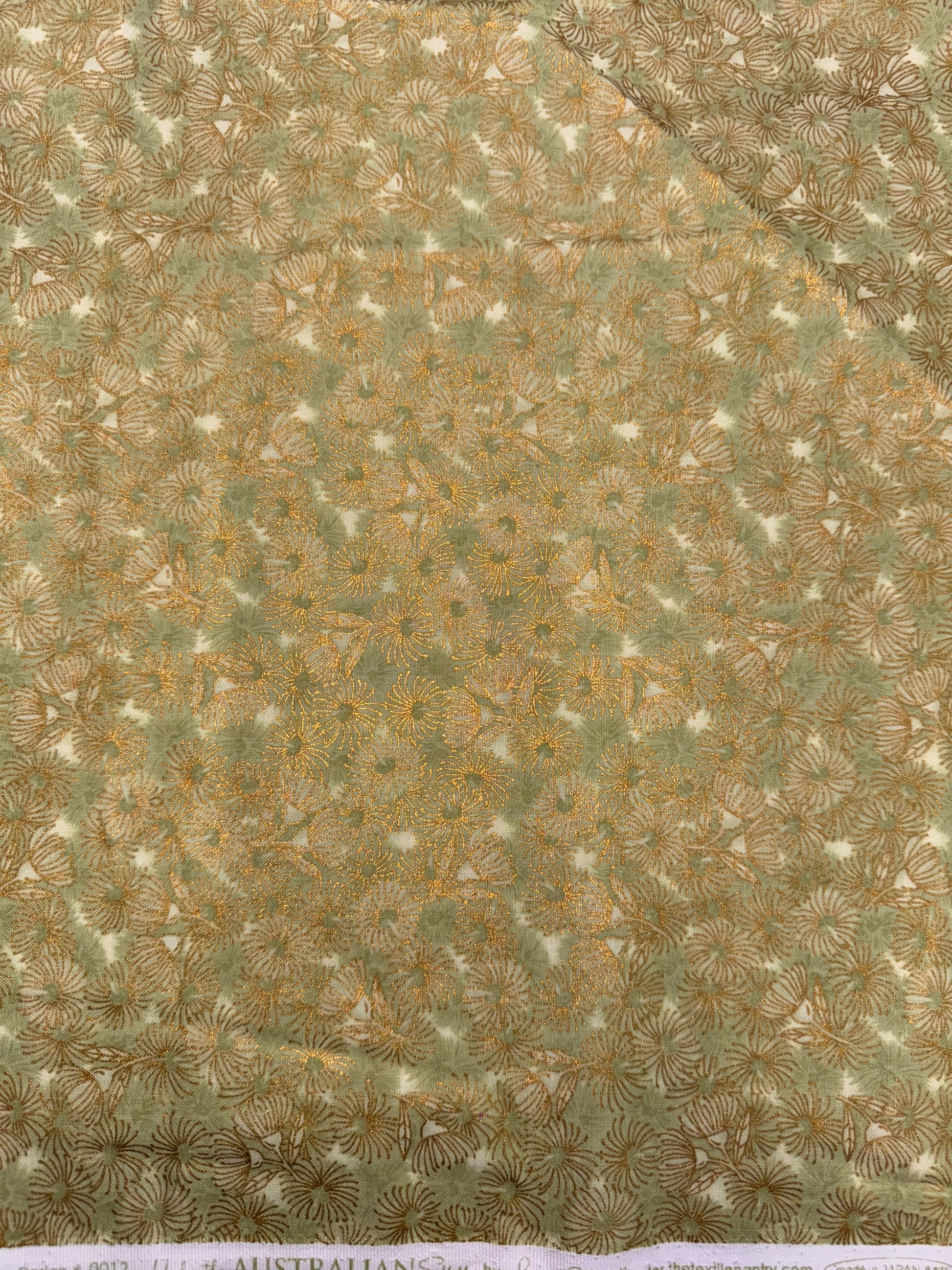 Gorgeous Gold Flowering Gums on a Green and Ivory background with highlights in metallic gold. Confidently mix and match with other Under the Australian Sun prints in the Traditional colour story.